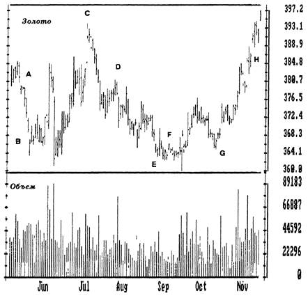 Рис. 10. Разрывы Закройте этот график листом бумаги и медленно сдвигайте его слева направо. А. Разрыв прорыва. Играйте на понижение с остановкой над верхним краем разрыва. В. Разрыв истощения, цены вернулись назад на следующий день. Нисходящий тренд кончился. Немедленно закрывайте позицию. С. Еще один разрыв истощения, отмеченный отсутствием новых максимумов после него. Несколько дней предлагается возможность играть на понижение с остановкой выше максимума. D. Разрыв продолжения в ходе нисходящего тренда. Играйте на понижение с остановкой над верхним краем разрыва. Цены активируют остановку через несколько дней, поскольку нет метода, застрахованного от неудач. Е. Разрыв истощения, закрывшийся через несколько дней. Закрывайте позицию немедленно. F. Обычный разрыв в области остановки цен. Рекомендуется не делать ничего. G. Разрыв прорыва. Играйте на повышение с остановкой чуть ниже нижнего края разрыва. Н. Разрыв продолжения. Добавляйте к открытой позиции еще и поместите остановку немного ниже нижнего края разрыва. Разрыв на правом краю диаграммы будет либо разрывом продолжения, либо истощения. Относительно небольшой объем намекает на продолжение. Если вы будете покупать, установите остановку ниже нижнего края этого разрыва. Некоторые разрывы настоящие, а остальные мнимые. Настоящий разрыв возникает тогда, когда рынок пропускает некоторый коридор цен. Мнимый разрыв возникает тогда, когда торги происходят на другом рынке в то время, когда данный рынок закрыт. Например, дневные графики с Чикагской биржи валютных фьючерсов полны мнимых разрывов. Валютой торгуют в Токио, Лондоне и в других местах, когда биржа в Чикаго закрыта. Когда биржа открывается, цены отражают итоги торгов за океаном. Все разрывы можно разделить на четыре основных группы: обычные, прорыва, продолжения и истощения. Вам нужно уметь различать их, поскольку каждый рассказывает свою историю и требует своей тактики в игре. Обычные разрывы Обычные разрывы (Common Gaps) быстро закрываются за несколько дней цены возвращаются в свой коридор. Обычные разрывы часто возникают на спокойных рынках без трендов. Они характерны для рынка фьючерсов с удаленной датой закрытия и для нижней границы рынка с малым объемом, когда все возможные позиции на продажу уже открыты. У обычных разрывов нет продолжения: новых максимумов после восходящего разрыва и новых минимумов после нисходящего. Объем может несколько возрасти в день обычного разрыва, но в последующие дни он возвращается к своим средним значениям. Отсутствие новых максимумов и минимумов, а так же постоянный объем, показывают, что ни у " быков", ни у " медведей" не появилось сильных чувств к этому рынку. Из всех разрывов, обычные наименее полезны для игрока. Обычные разрывы возникают чаще, чем остальные. На застойном рынке они возникают очень легко. Торговец в зале однажды рассказывал на семинаре, как он может сдвинуть золото на два доллара вверх или вниз в тихий день. Он был крупный игрок и если он подавал заявку на 20 контрактов сразу, другие игроки обращали на это внимание, считая, что ему стало что-то известно. Золото подскакивало вверх, и его задачей было продать до того, как разрыв закроется. Последивидендовый разрыв возникает на рынке ценных бумаг в день выплаты дивиденда и это обычный разрыв. Например, если дивиденд составляе