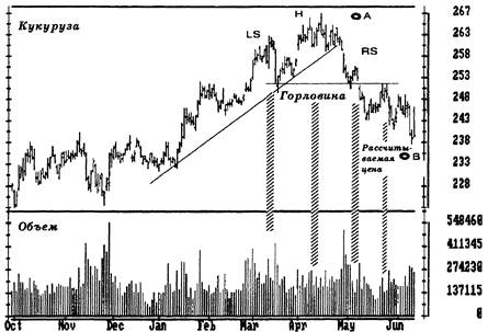 Рис. 11. " Голова" и " плечи" Восходящий тренд считается сильным, когда новые подъемы достигают новых максимумов. Растущий объем подтверждает подъемы цен. Объем падает, когда цены достигают " головы" (Н) и указывает на необходимость ужесточить остановки по открытым позициям. Спад после " головы" прорывает линию тренда и говорит о том, что он заканчивается. В данном случае " голова" является “островным разворотом” (см. “Разрывы”, глава 3.5). Это очень сильный сигнал " медведям". Объем несомненно растет во время спада после " головы". Правое " плечо" (RS) много ниже левого (LS) - это еще один признак слабости. Низкий объем в правом " плече" так же показывает на хорошую возможность играть на понижение. Спад от правого плеча прорывает линию " горловины". Это завершает формирование " головы" с " плечами". Когда цены снова подойдут к линии горловины с низким объемом, это будет отличная возможность играть на понижение. Расстояние от вершины головы до линии " горловины" (А) дает оценку глубины спада. На правом краю графика продолжайте игру, поскольку цены падают при высоком объеме и еще не достигли проектируемого уровня. Предохранительную остановку поместите на верхнем краю диапазона за последние 5 дней. После пересечения линии " горловины", цены часто возвращаются к ней при меньшем объеме. Этот слабый подъем дает отличную возможность для продажи с мерой предосторожности как раз над уровнем линии " горловины". Вершины " голова" и " плечи" часто сопровождаются типичной динамикой объема. Объем обычно ниже в " голове", чем в левом " плече". В правом " плече" он еще ниже. Объем тяготеет возрастать, когда цены прорывают линию " горловины". При обратном подходе к ней он очень мал. " Голова" и " плечи" дают возможность рассчитать уровень цен, для нового нисходящего тренда. Вы можете получить его, измерив расстояние от вершины " головы" до линии " горловины" и отложив его от линии " горловины" вниз. Правила игры После того, как фигура " голова" и " плечи" обнаружена, вам необходимо принять два решения: что делать с открытой позицией и как приступить к продаже. С открытой позицией можно поступить тремя способами: немедленно закрыть, ужесточить меры предосторожности, часть закрыть, а часть оставить открытыми. Многие игроки выбирают четвертый путь, они просто замирают и не делают ничего. Игра на бирже сложна, нетривиальна и требует принятия решений в атмосфере неопределенности. Ваше решение должно определяться тем, насколько вы уверены в фигуре. Оно так же зависит от размеров вашего счета. Большой счет позволит вам продавать и покупать постепенно. Игра с одним контрактом при малом счете требует точного выбора момента, это отличная школа для начинающего игрока. Вам следует проанализировать графики для нескольких временных масштабов (см. главу 5.5). Если на недельном графике образуется вершина, то " голова" и " плечи" на дневном графике требуют бежать из рынка. Если недельный тренд силен, то часто достаточно просто ужесточить остановки. Технические индикаторы тоже помогают понять, насколько срочно нужно начинать продажу. Рынки обычно более склонны к резким перепадам цен, когда они формируют вершины. Продажа с мерой предосторожности выше последнего максимума может подвергнуть вас большему риску, чем позволяет ваш счет для работы с одним контрактом (см. главу 10). Вам, может быть, придется 