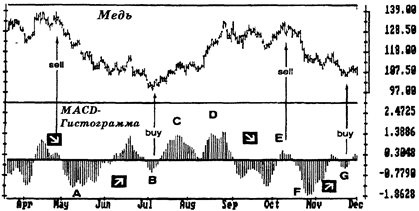 Рис. 19. Расхождения MACD-гистограммы MACD-гистограмма подтверждает тренд, когда он дает новые максимумы и минимумы одновременно с ценами. Новые минимумы MACD-гистограммы в точках А и F подтверждают нисходящий тренд. Новые минимумы этого индикатора говорят игроку о том, что нисходящий тренд, вероятно, снова достигнет минимальных значений А и F или опустится еще ниже. Новые максимумы С и D MACD-гистограммы подтверждают восходящий тренд. Они говорят о том, что восходящий тренд, вероятно, снова достигнет или превзойдет максимумы С и D. Дивергенция между MACD-гистограммой и ценами указывают на основные точки разворота. Эти сигналы появляются редко, но если они появились, то, как правило, позволяют уловить моменты основных разворотов и начала нового тренд а. Дивергенция " быков" А-В дает прекрасную возможность купить. Цены в новом минимуме, а минимум индикатора выше предыдущего. Это говорит о том, что " медведи" выдохлись и " быки" готовы перехватить инициативу. Дивергенция " медведей" D-E дает прекрасную возможность для продажи. На правом краю графика оказалась дивергенция " быков" F-G. Лучшее время для покупки тогда, когда MACD-гистограмма двинется вверх из своего второго минимума G. Если вы играете на повышение, поместите предохранительную остановку ниже минимума цен G. Повышайте ее по мере развития тренда. 1. Покупайте, когда MACD-гистограмма перестает падать и движется вверх. Поместите предохранительную остановку ниже последнего локального минимума. 2. Продавайте, когда MACD-гистограмма перестанет расти и пойдет вниз. Поместите предохранительную остановку выше последнего локального максимума. Дневная MACD-гистограмма так часто движется вверх и вниз, что продавать и покупать всякий раз, когда это происходит, не практично. Изменения наклона MACD-гистограммы значительно более информативно на недельном графике, поэтому именно она включена в Систему Трех Экранов (см. главу 9.1). Когда ждать новый пик или спад MACD-гистограмма работает как фары у машины - она позволяет игроку увидеть дорогу впереди. За максимумами и минимумами этого индикатора обычно следуют максимумы и минимумы цен. Рекордный за последние три месяца пик на ежедневной MACD-гистограмме показывает, что " быки" чрезвычайно сильны и цены, скорее всего, поднимутся еще выше. Рекордный минимум на MACD-гистограмме за последние три месяца показывает, что впереди, видимо, еще более низкие цены. Когда MACD-гистограмма достигает максимальных значений во время подъема цен, то восходящий тренд в полном здравии и следующий подъем должен достичь или превзойти предыдущий максимум. Если MACD-гистограмма падает до нового минимального значения во время нисходящего тренда, то " медведи" сильны и спад, вероятно, достигнет или превзойдет предыдущий минимум. Самый сильный сигнал технического анализа Дивергенция между ценами и MACD-гистограммой возникает на любом рынке только несколько раз в году, но она дает один из самых сильных сигналов в техническом анализе. Эта дивергенция указывает на основные точки разворота и дает особенно сильный сигнал о покупке или продаже. Сигнал не возникает в каждом важном максимуме или минимуме, но если вы его видите, то это значит, что вскоре должно быть фундаментальное изменение направления. Когда цены поднимаются к новому максимуму, а MACD-гистограмма останавливается на более низком значении, об
