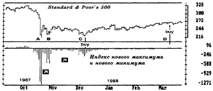 Рис. 42. Индекс нового максимума и нового минимума Рынок акций обвалился в октябре 1987 года, и число новых минимумов повысилось до 1300 (А). Рынок дернулся («конвульсии дохлой кошки») и вновь достиг того же минимума (В). Газеты были полны тревожных статей, посвященных концу западной финансовой системы в том виде, в каком мы к ней привыкли. У NH-NL было более оптимистичное мнение. Его минимумы мельчали, офицеры отказывались убегать. Рынок вновь дал тот же минимум в декабре (С) и NH-NL указал на еще более сильную дивергенцию " быков", давая сигнал к покупке. Сигнал был подтвержден, когда индекс добрался до положительных значений (D). Это было начало 2-летнего рынка " быков". 1. Если NH-NL дает менее высокий пик, когда рынок взлетает к новому максимуму» создается дивергенция " медведей". Она показывает, что руководство " быков" слабеет, хотя рынок в среднем и стоит выше. Дивергенция " медведей" отмечает конец восходящего тренда. Если последний пик NH-NL +100 или меньше, то вероятно, что впереди крупный поворот назад и пора начинать продавать. Если последний пик много выше, чем +100, то оставшееся руководство достаточно сильно для того, чтобы предохранить рынок от коллапса.