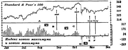 Рис. 43. Индекс нового максимума и нового минимума Индекс нового максимума и нового минимума дает свои лучшие сигналы, когда он расходится с ценами. Этот график показывает, что произошло перед мини-крахом 1989 года и как началось восстановление. Рынок достиг нового максимума в августе (А), который сопровождался новым пиком NH-NL, что указывало на то, что рынок поднимется еще выше. Подъем сентября (В) сопровождался дивергенцией " медведей", дававшим сигнал к продаже. Рынок добился нового максимума в октябре (С), но NH-NL дал менее высокий пик, повторив сигнал к продаже. NH-NL стал отрицательным за один день до краха, решительно подтвердив сигнал продавать. За минимум октября (D) последовал рефлекторный подъем («конвульсии дохлой кошки») и цены дважды повторили октябрьский минимум. В обоих случаях NH-NL давал менее глубокие спады, чем в октябре. Эти дивергенции " быков" давали сигнал к покупке и новый восходящий тренд действительно начался. 2. Если NH-NL дает менее глубокий минимум, когда рынок падает до нового дна, создается дивергенция " быков". Это говорит о том, что руководство " медведей" сокращается, хотя рынок и пошел вниз. Если последний минимум NH-NL около -100, то это значит, что руководство " медведей" исчерпало себя и близок крупный разворот рынка. Если минимум NH-NL много ниже, чем -100, значит руководство " медведей" сохранило достаточно сил и нисходящий тренд может притормозить, но вспять не пойти. Помните, что дивергенция " быков" на дне рынка ценных бумаг обычно формируется быстрее, чем дивергенция " медведей" на вершине рынка. Покупайте быстро и, продавайте медленно. Наклон NH-NL в каждый день определяется ходом его столбиков за последние несколько дней. Если рынок растет и NH-NL повышается, то это подтверждает восходящий тренд. Если NH-NL падает вместе с рынком, то это подтверждает нисходящий тренд. 3. Подъем NH-NL говорит о том, что держать позицию или добавлять к ней безопасно. Если NH-NL падает, когда рынок в целом остается ровным или поднимается, значит пора извлекать прибыль по краткосрочным открытым позициям. Если NH-NL падает, это говорит о силе руководства " медведей" и о том, что держать открытые позиции на продажу и добавлять к ним безопасно. Если рынок продолжает падать, а NH-NL растет, то нисходящий тренд под вопросом, пора закрывать позиции на продажу. 4. Если NH-NL поднимается при ровном дне на рынке, загорается сигнал для " быков", приглашающий к покупке. Это говорит о том, что офицеры движутся к вершине, а солдаты пока отсиживаются в своих окопах. Когда NH-NL падает, а рынок в этот день не двигается, то это дает сигнал для продажи. Это говорит о том, что офицеры дезертируют, а солдаты все еще удерживают свои позиции. Солдаты не дураки, если офицеры сбежали, они не будут продолжать сражаться. Положение NH-NL относительно средней линии показывает, кто, " быки" или " медведи", у власти. Если NH-NL выше средней линии, значит большее число лидеров рынка ближе к " быкам", чем к " медведям". Выгоднее покупать и пытаться играть на повышение. Когда NH-NL ниже средней линии, это значит, что руководство " медведей" сильнее и разумнее играть на понижение. Во время рынка " быков" NH-NL может месяцами оставаться над средней линией, а во время рынка " медведей" месяцами оставаться под ней. 5. Если NH-NL несколько месяцев остается под средней линией, а потом поднимается над ней, то вероятно, что начинается вре
