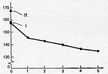 Рис. 7.2. Результаты воображаемого многоуровневого эксперимента с влиянием кофеина на время реакции. Ось абсцисс — дозы кофеина (мг/кг). Ось ординат — время реакции (мс). I — плацебо, II — без таблетки