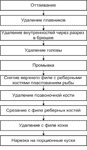 Обработка рыбы для использования в целом виде. Процесс обработки этой рыбы со- стоит из очистки чешуи, удаления плавников, жабр, внутренностей (через разрез на брюшке), промывания. В целом виде применяют мелкую рыбу (салаку, корюшку, свежую сельдь), а также более крупную (судака, лососевых) для приготовления банкетных блюд. Обработку на доске, маркированной Р. С. (рыба сырая), начинают с очистки чешуи в на- правлении от хвоста к голове, вначале с боков, затем с брюшка. Рыбу очищают вручную средним поварским ножом, теркообразным или механическим скребком РО-1 (производи- тельностью около 50 кг/ч). При обработке большого количества рыбы на крупных предприятиях общественного пи- тания используют специальные чешуеочистительные машины. С помощью специального ба- рабана очищают рыбу с крупной чешуей. Его производительность 1, 5 т/ч с одновременной загрузкой до 160 кг рыбы, время очистки от 2 до 5 мин. Чешуеочистительной машиной про- изводительностью 20–30 рыб в минуту очищают рыбу с мелкой чешуей (треску, камбалу, морского окуня). В первом случае чешуя снимается при соприкосновении с терочной по- верхностью барабана, а во втором – с помощью быстро-вращающегося ролика с шипами. После очистки у рыбы удаляют плавники, начиная со спинного. Для этого рыбу кладутна бок и прорезают мякоть вдоль плавника сначала с одной, а затем с другой стороны. Но- жом прижимают подрезанный плавник и, держа рыбу за хвостовую часть, отводят в сторону, при этом плавник легко удаляется. Использование такого способа исключает возможность укола о плавник, что особенно важно при обработке окуневых рыб. Так же удаляют и аналь- ный плавник, после чего отрезают или отрубают остальные плавники. Очищать чешую и удалять плавники следует аккуратно, чтобы не повредить кожу. Из головы рыбы необходимо удалить жабры (делая с двух сторон надрезы под жаберны- ми крышками) и глаза. Для удаления внутренностей рыбу кладут на доску головой к себе, придерживая левой рукой, делают надрез между грудными плавниками и ведут нож к голове, острием к себе, прорезая брюшко. Доведя нож до головы, его поворачивают, не вынимая из брюшка, и ведут в противоположном направлении, разрезая брюшко до анального отверстия. Из разрезанного брюшка осторожно вынимают внутренности так, чтобы не повредить желчный пузырь, иначе рыба будет иметь горький вкус, и зачищают внутреннюю полость от пленки. Рыбу промы- вают холодной водой, обсушивают, уложив на противень, и до тепловой обработки хранят в холодильнике. При обработке рыбы на крупных предприятиях и в специализированных цехах плавники удаляют с помощью специальной плавникорезки производительностью 30 рыб в минуту, а хвостовой плавник отрезают на дисковой рыборезке Масса обработанной целой рыбы с головой уменьшается приблизительно на 20%. Если у такой рыбы удалить также голову, то количество отходов будет составлять 35%. Разделка рыбы на порционные куски (кругляши). Процесс разделки рыбы на порци- онные куски (кругляши) с кожей, позвоночными и реберными костями состоит из очистки чешуи, удаления плавников, головы, внутренностей (через отверстие, образовавшееся после отрезания головы), промывания, нарезки. Так обрабатывают рыбу средних размеров, массой до 1, 5 кг. Рыбу очищают от чешуи вышеописанным способом и удаляют плавники. Средним по- варским ножом надрезают мякоть