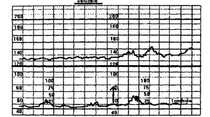 a. Различают кратковременные (мгновенная вариабельность или «от удара к удару») и медленные колебания ЧСП, которые характеризуются амплитудой и частотой (рис. 1). b. Мгновенная вариабельность ЧСП отражает состояние его метаболизма и гемодинамики: её наличие возможно только при нормальной взаимосвязи ЦНС и проводящей системы сердца плода, условием чего является удовлетворительная оксигенация мозга плода. с. Малая интенсивность вариации ЧСП или потеря мгновенной вариабельности - монотонность ритма, характеризуется уменьшением амплитуды мгновенных колебаний менее З^^д/мин и частоты менее 2 в мин. При-жТТы снижения вариабельности ЧСП: • Асфиксия (рис.2). • Медикаменты (атропин, транквилизаторы, наркотики, барбитураты, анестетики, нейролептики, сернокислый магний). • Недоношенность (рис. 3). • Тахикардия • Физиологическое состояние спокойного сна плода • Аномалии развития сердца и ЦНС • Аритмия 3. АКЦЕЛЕРАЦИЙ ЧАСТОТЫ СЕРДЦЕБИЕНИЯ ПЛОДА -ускорения ЧСП с амплитудой 1£ ^уд/шиии выше и длительностью более 15 сек. a. Все акцелераций, имеющие параметры ниже указанных, должны быть отнесены к колебаниям ЧСП и включены в показатель вариабельности ЧСП. b. Акцелераций могут быть спонтанными, но чаще связаны с движениями плода. c. Наличие акцелераций, особенно в ответ на движения плода, как правило, свидетельствует об отсутствии тяжелого ацидоза и гипоксии плода. Рис.) Нормальная вариабельность ЧСП.