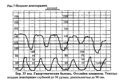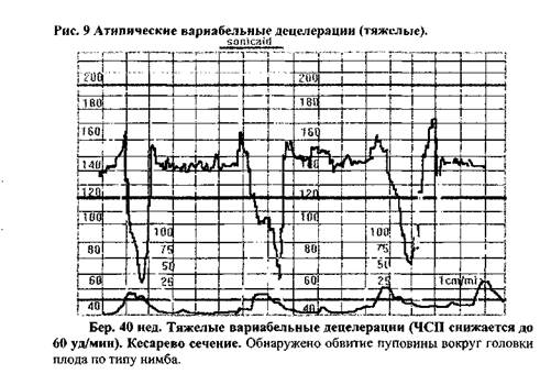 А. Дистресс плода в родах - термин, используемый для определения гипоксии и ацидоза у плода в родах. Рожениц с дистрессом плода можно разделить на 2 группы: Группа 1. Дистресс развивается при беременности с хроническим нарушением обмена между матерью и плодом и усугубляется в родах. 1. Причини со стороны матери: a. гестоз b. диабет c. хроническая артериачьная гипертензия d. заболевания сердца (класс II или выше) 2. Причины со стороны плода: a. гемолитическая болезнь b. многоплодная беременность (трансфузионный синдром) c. недоношенность 3. Причины, связанные с плацентой: a. анатомические аномалии плаценты (оболочечное или краевое прикрепление пуповины) b. переношенная беременность c. первичная плацентарная недостаточность d. предлежание пуповины Группа II. Дистресс появляется при нормальной беременности или в родах без каких-либо признаков хронического нарушения обмена между матерью и плодом. Ятрогенные причины: a. стимуляция родовой деятельности окситоцином (гиперстимуляция и гипотензия) b. регионарная анестезия (гипотензия) c. применение гипотензивных средств D. позиция роженицы (положение на спине - синдром сдавления нижней полой вены) 1. Острые случаи: a. преждевременная отслойка плаценты b. осложнения со стороны пуповины (выпадение, истинный узел) В. ПРИЗНАКИ ИНТРАНАТАЛЬНОГО ДИСТРЕССА ПЛОДА 1 НАЛИЧИЕ ГУСТОГО МЕКОНИЯ. СТОЙКИЕ ПОЗДНИЕ ДЕЦЕЛЕРАЦИИ ЛЮБОЙ ВЫРАЖЕННОСТИ. СТОЙКИЕ РЕЗКО ВЫРАЖЕННЫЕ (АТИПИЧЕСКИЕ) ВАРИАБЕЛЬНЫЕ ДЕЦЕЛЕРАЦИИ. ПРОДОЛЖИТЕЛЬНАЯ ВЫРАЖЕННАЯ БРАДИКАРДИЯ. ПОЗДНИЕ ДЕЦЕЛЕРАЦИИ ИЛИ АТИПИЧЕСКИЕ ВАРИАБЕЛЬНЫЕ ДЕЦЕЛЕРАЦИИ, ПЕРЕХОДЯЩИЕ В ВЫРАЖЕННУЮ БРАДИКАРДИЮ. ИМЕЮТСЯ ИЗМЕНЕНИЯ рН В КРОВИ, ВЗЯТОЙ ИЗ ГОЛОВКИ ПЛОДА. ПОСЛЕ ТОКОЛИТИЧЕСКОЙ ТЕРАПИИ НЕТ УЛУЧШЕНИЯ ИЛИ ПОВТОРНО ПОЯВЛЯЮТСЯ ПАТОЛОГИЧЕСКИЕ ВАРИАНТЫ ЧСП.
