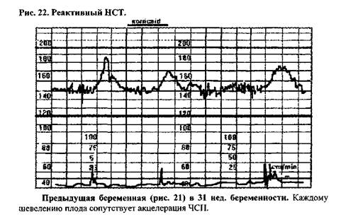 Характеризуется отсутствием акцелераций в ответ на шевеление плода или наличием только одной акцелераций (рис. 23). • Не свидетельствует о наличии гипоксии у плода • Возможно является следствием нахождения плода в момент исследования в состоянии " спокойного сна" (ложноареактивный НСТ) • Возможно обусловлен медикаментозным влиянием на плод (транквилизаторы, анальгетики, барбитураты, седативные, нейролептики, антигистаминные, сульфат магния) • Служит показанием к проведению стрессового теста (см. ниже) и дальнейшее ведение беременной планируется исходя из результатов контрактильного стрессового теста. • Связан с небольшим сроком гестации - физиологическая ареак-тивность (см. таблицу 4) (рис. 21). S В связи с высокой частотой ареактивного НСТ при недоношенной беременности рекомендуется в сроки 28-32 недели осуществлять запись КТГ не менее 60 мин. ^ Не имеет большого смысла проведение НСТ до 28 недель беременности. c. НЕУДОВЛЕТВОРИТЕЛЬНЫЙ ИЛИ НЕАДЕКВАТНЫЙ НСТ. Качество мониторной записи не позволяет произвести интерпретацию данных.