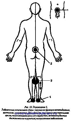 и там, внутри, где-то примерно посередине начинаем перемещать это ощущение с боку на бок на уровне по ходу тазобедренных суставов (складок), как это показано на рис 14. Делаем такие упражнения 15-20 раз в каждую сторону. После этого, не прерываясь, переходим к упражнению 1в (рис. 15). Упражнение 1в (рис. 15). В области чуть выше тазобедренных суставов, в глубине (а и б) - справа или слева усиливаем ощущения до разумного максимума, одновременно удерживая его в течение 8-10 сек., затем перемещаем чуть ниже в область за мочевым пузырем (в), где также удерживаем 8-10 сек. на том уровне, затем перемещаем в противоположную сторону в область (а или б) - аналогично удерживая там, затем вновь возвращаемся в область В. Это один проход, такие проходы делаем 5-6 раз. Лучше всего сделать все эти 3 упражнения сначала на одном ощущении Т + П, затем на X + П. Но можно и по-другому: каждое упражнение по порядку, последовательно на Т, П и X. Упражнение выполняется при снижении потенции у мужчин и сексуальности у женщин. Концентрируем Т в области мочевого пузыря (1), усиливаем его до разумного максимума, затем делаем 5-10 проходов вглубь назад, как бы насквозь (2), останавливаемся на 2-3 сек., в глубине, примерно посередине. Далее концентрируем Т в области правой пятки (4), доводя до разумного максимума, затем перемещаем вверх по задней поверхности голени, не доходя до подколенной ямки. Переходим на боковую поверхность, усиливаем Т и держим его до 2-3 сек., переходя затем на эту же область левой ноги (3), где также держим до 2-3 сек., и опускаемся вниз до пятки. После остановки на 2-3 сек. возвращаемся тем же путем вновь до правой пятки. Это один проход. Таких проходов сделаем 5-10 на каждое ощущение. Начать можно с любой пятки.
