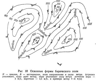 Выше сказано, что атмосферные фронты связаны с циклоном. Циклоны и антициклоны—крупные атмосферные вихри (во внетропических широтах). Они играют важную роль в общей циркуляции атмосферы, в формировании и изменении погоды, служат механизмом меж-широтного обмена (переноса) холодных и теплых масс воздуха на большие расстояния Диаметр их по горизонтали обычно 1000—2000, а нередко 3000 км и более Вертикальная протяженность их невелика и зависит от интенсивности и стадии развития. Мелкие образования, находящиеся в начальной стадии развития, обнаруживаются на высотах до 2—4 км, а развившиеся — до 15—20 км и более. Вихревая форма циркуляции в циклонах и антициклонах определяется полем давления. В циклонах атмосферное давление наиболее низкое в центре, а к периферии растет. В антициклонах, наоборот, в центре давление наибольшее, а к периферии уменьшается. Течение воздуха в первом случае направлено против часовой стрелки от периферии к центру, а во втором — по часовой стрелке (в северном полушарии) от центра к периферии (рис. 7).