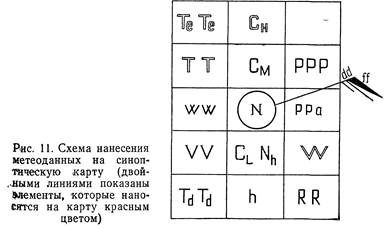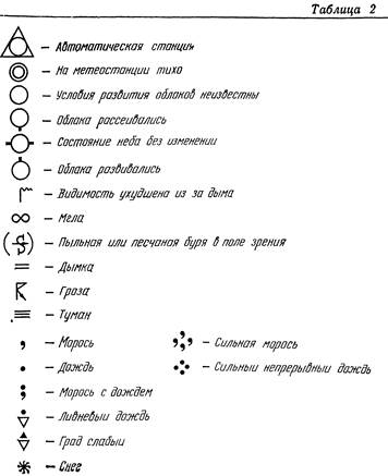 Сведения о погоде в пункте наблюдения, сообщаемые в телеграмме, наносятся на приземную карту по схеме, приведенной на рис. 11. Кружком обозначена метеорологическая станция. Значения буквенных символов и порядок нанесения метеорологических данных на карту погоды следующие. N — общее количество облаков в баллах (наносят в кружочке станции в соответствии с гр. 2 табл. 3); dd — направление ветра; ff — скорость ветра в срок наблюдения (направление ветра обозначено стрелкой. Ее «острие» — кружок станции; оперение — скорость, причем длинное перо — 5 м/с, короткое — 2, 5 м/с; если скорость ветра 1 м/с — стрелка без оперения, скорость ветра 25 м/с — зачерченный треугольник. Когда на метеостанции тихо, ее кружок обводится еще одним кружком); VV - горизонтальная видимость в цифрах кода, например: 5—0, 5 км, 10—1 км, 15—1, 5 км, 40—4 км, 56—6 км, 57—7 км, 60—10 км, 70-20 км и т. д.; WW —погода во время наблюдения или за последний перед наблюдением час (наносится на карту согласно коду КН=01). Для обозначения погоды в срок наблюдения или за последний час существует 99 различных символов (см. табл. 3) Если явление окончилось до наблюдения, но отмечалось в последний час, то значок выносится за квадратную скобку влево: