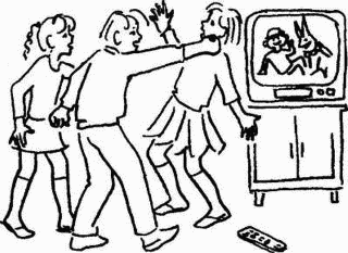 АНЯ: Она включила, а он переключил, а она снова включила, а тогда он ее толкнул... от так... (Показывает.)