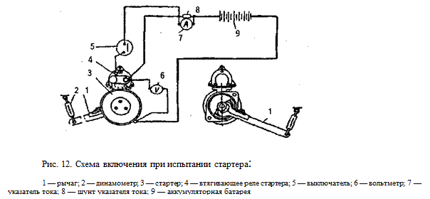 Неисправности стартера. К основным неисправностям стартера относятся ослабление крепления подводящих проводов, изнашивание или загрязнение щеток и коллектора, окисление контактов выключателя, обрыв или замыкание в обмотках, изнашивание деталей муфты свободного хода и зубьев шестерни. Эти неисправности приводят к тому, что стартер не работает совсем, не развивает нужные частоту вращения и мощность, при включении якорь стартера вращается, а коленчатый вал неподвижен, создается сильный шум при включении и работе стартера. При включении стартер не работает совсем, характерных щелчков тягового реле не прослушивается. Для выявления причин нужно включить фары и стартер. Если при включении стартера накал ламп не будет изменяться, это указывает на плохой контакт или обрыв в цепях вспомогательного реле либо в цепи основного рабочего тока стартер. Если накал ламп сильно уменьшается, то вероятной причиной может быть плохое состояние аккумуляторной батареи или нарушение контакта в ее клеммных соединениях, а также неисправность электродвигателя стартера. Места плохого контакта в электрических цепях и обрыва определяются последовательным подключением контрольной лампы в указанных электрических цепях. При необходимости надо проверить степень заряженности аккумуляторной батареи. Если при включении стартера прослушиваются характерные щелчки, это означает, что тяговое реле исправно. При включении стартера коленчатый вал проворачивается очень медленно. Наиболее частыми причинами этого являются недостаточная заряженность аккумуляторной батареи, окисление и (или) ослабление креплений контактов рабочей электрической цепи стартера или пробуксовка (проворачивание) роликовой муфты свободного хода. При исправной аккумуляторной батарее стартер необходимо снять для проверки и устранения неисправностей. При включении стартера якорь вращается, а маховик неподвижен. Причинами этой неисправности могут быть пробуксовка муфты свободного хода, выпадение оси или поломка рычага муфты, поломка поводкового кольца муфты или буферной пружины. Сильный шум при включении и работе стартера возможен при ослаблении его крепления, обрыве удерживающей обмотки втягивающего реле, поломке зубцов шестерни привода и венца маховика. Сильный шум после пуска двигателя означает, что стартер не выключается. Необходимо быстро заглушить двигатель, отключить аккумуляторную батарею, проверить крепление стартера, а при необходимости снять его и проверить состояние зубцов шестерни привода и обмоток втягивающего реле (замыкание). Ремонт стартера включает в себя проверку работоспособности на стенде, разборку, проверку деталей и сборку. Проверка стартера производится на специальном стенде в режиме холостого хода и под нагрузкой. Электрическая схема включения стартера при проверке приведена на рис. 12. Соединительные провода к батарее и амперметру должны иметь сечения не менее 16 мм2. При подводимом напряжении 12 В стартер должен на холостом ходу потреблять ток в пределах 70...85 А (в зависимости от модели), а частота вращения якоря должна быть в пределах 5000+500 мин -1. Повышенный потребляемый ток, пониженная частота вращения, а также шум во время работы свидетельствуют об электрических или механических неисправностях. Уменьшенный потребляемый ток и пониженная