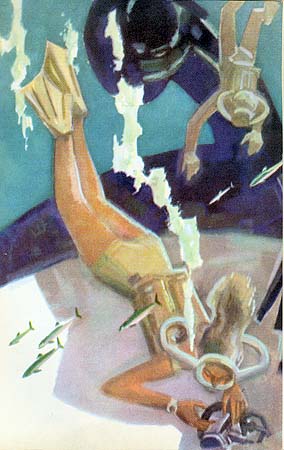 Визгливый вопль старшего инспектора разорвал оцепенелое молчание. Он кинулся к Чезаре, но художник оттолкнул его изо всей силы и поднял бесчувственную Леа. – Ко мне, – вопил полицейский, – хватайте их обоих, они разыграли комедию! Я арестую их! – Опомнитесь, вы, офицер! – послышался четкий голос Сандры. – До сих пор вы представляли закон, и мы подчинялись вам. А сейчас вы действуете, как… как гестаповец. Разве вы не видите, что произошло несчастье! Придите в себя, стыдно! Инспектора будто облили холодной водой. – Посмотрим, – угрюмо буркнул он, давая знак своим помощникам отойти. – Что с ней такое? – С мисс Леа Мида, вы имеете в виду? – Да, да, конечно же! – Может быть, обморок после глубокого погружения… может быть, тепловой удар – она стояла на солнце после холодной воды. Увидим. Да вот она приходит в себя! Леа широко раскрыла недоумевающие глаза, подняла руку, чтобы вытереть обрызганное водой лицо. Чезаре отнес ее в тень рубки, где лейтенант уже расстелил матрас и положил подушку. Леа оглянулась кругом, явно не узнавая присутствующих. – Чезаре, милый, – сердце художника дрогнуло, Леа узнала его, – кто эти люди? Зачем мы здесь? Со мной что-нибудь случилось? – Ничего не случилось, дорогая! Лежи спокойно, это у тебя после долгого погружения! Мы нашли корабли… – Какие корабли? Да, помню, амфоры у Кротоне? Чезаре похолодел и беспомощно оглянулся на обступивших его товарищей. – Вы сами успокойтесь, Чезаре! Отнесем Леа в каюту, дадим снотворного – поспит и придет в себя. Поднимите ее, – обратилась Сандра к лейтенанту и инженеру. Те послушно подняли Леа. – Кто они? Зачем меня несут? – спрашивала Леа, и ее голосок, ставший по-детски слабым и тонким, болезненной жалостью отдался в душе Чезаре. Инспектор с подозрением следил за тем, как ее уносили. – Я далеко не уверен, что весь этот спектакль не разыгран нарочно, – начал он. Капитан не дал ему окончить: – Довольно, сэр! Мы немедленно снимемся с якоря и идем в Кейптаун. Возможно, потребуются искусные врачи, эти глубокие спуски иногда дают тяжелые последствия, Во имя закона, какие у вас к нам претензии? Считайте, что корона или что бы это там ни было не найдена. Мы нашли, мы и положили ее на место, где ваше правительство, храни его бог, возьмет, если найдет нужным. Все осталось как было до нашей приятной встречи. – Ирония ваша неуместна, сэр. Я оказался глупцом, обойденным, как мальчишка! – Никто вас не намерен обходить! Случайность, господин инспектор! Но примите искренний совет: открытие кораблей – это сенсация, которая привлечет сотни репортеров. И если каждому из них будет сообщено о не вполне соответствующем нормам поведении старшего инспектора, простите, не расслышал фамилии, сэр… – Ван-Каллен. Но мне хотелось бы разойтись по-хорошему. Может быть, кто-нибудь из ваших водолазов попробует спуститься и поднять корону? Наверное, она лежит на песке под кораблем, на виду. Тогда у нас все будет по-хорошему. В это время из дверей каютного помещения появился Чезаре. – Я спущусь сам! Моя ошибка; и я попытаюсь ее исправить. В этом акваланге еще достаточно воздуха. Лейтенант перевел слова художника, и лицо инспектора просветлело. – Дорогой дядя, – повернулся Чезаре к Каллегари, почему-то называя его неофициально, – у вас есть, кажется, один такой милый камешек, знаете, круглый, килограммов на двести… – Художник гово