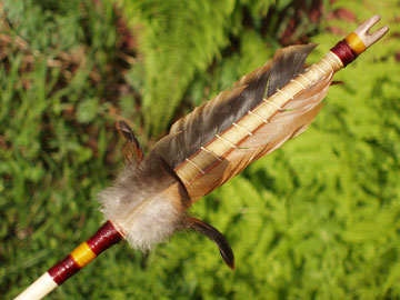 В прорезь нужно вставить тетиву, выемки - чтобы руки не соскальзывали. Потом необходимо изготовить оперенье. Его можно сделать из птичьиз перьев. Из одного птичьего пера можно вырезать два три оперения (в зависимости от его длины). Длина оперения находится в пределах от 5, 0 до 9, 0 см. Лучшие перья для стрелы - индюшачьи. Перо разрезается ножницами вдоль ствола, и затем от него отрезаются куски заданного размера. Для оперения должна использоваться лучшая часть пера, ближе к основанию ствола. Перья перед приклеиванием можно окрашивать в нужные цвета. Обрезанное ножницами оперение имеет неравномерный по строению ствол, который необходимо обработать так, чтобы его можно было приклеить к стреле. Обработка ствола оперения производится либо на наждачном круге (при его вращении), шлифуя сердцевину ствола, либо шлифовкой наждачной бумагой. Последний способ проще и более гарантирует от ошибок. Шлифовка делается так: оперение сжимается между двумя металлическими пластинками толщиной около 0, 5-0, 7 мм. Остающаяся снаружи часть ствола пера ошлифовывается по наждачной шкурке, которая находится на ровной доске. Так как пластинки держатся перпендикулярно доске, то после шлифовки торец оперения будет прижиматься к стреле равномерно. Так же производится шлифовка боковых граней стержня оперения. Изготовленные таким образом оперения наклеиваются на стрелу. Подбор и наклейку оперения на один комплект стрел необходимо производить из перьев одноименного крыла. Неправильно наклеенные оперения (например, взятые из разных крыльев) могут привести к отличиям в полете стрелы по сравнению с другими стрелами. Наклеенные на стрелы оперения обжигаются раскаленной проволокой для придания им определенной формы, для чего применяется специальный станочек. В настоящее время стрелки из лука используют оперения, приобретаемые у различных фирм, которые качественно изготовлены под любые стрелы и различных видов стрельб. Можно перья примотать прочными нитками (шелк, капрон и др.)