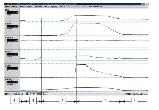 Рисунок 4 Пример записи осциллограммы выходных параметров инжекторной системы управления двигателем выполненной с помощью мотор-тестера. XNJ- время впрыска топлива; JAIR- цикловой расход воздуха; TWAT- температура охлаждающей жидкости; UOZ- угол опережения зажигания; THR- положение дроссельной заслонки; FREQ- частота вращения коленчатого вала. Характерные участки работы двигателя: 1-холостой ход; 2-разгон; 3-торможение двигателем; 4-переходные процессы и выход системы на режим холостого хода 5.