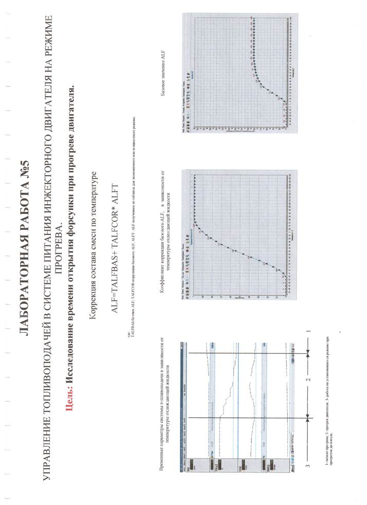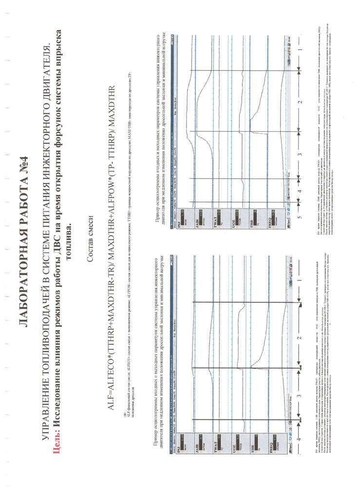 Все работы, выполняемые на стенде проводить только в присутствии преподавателя. Конструкция лабораторного стенда выполнена таким образом, чтобы обеспечить максимальную приближенность характеристик стенда к выходным параметрам реального инжекторного двигателя при имитации заданных условий эксплуатации. Запуск стенда (подача питания на узлы системы управления инжекторного двигателя, пуск двигателя имитатора положения коленчатого вала) и его остановка осуществляется поворотом ключа замка зажигания по часовой стрелки. Старт двигателя осуществляется как и на автомобиле, дополнительным поворотом ключа по часовой стрелке из положения «зажигание вкл.» в положение «Стартер». При этом необходимо приложить дополнительное усилие для преодоления силы возвратной пружины замка зажигания. Рекомендуемое время удержания ключа в положении «Стартер» 2-Зсек. После запуска стенда ключ можно отпустить и под воздействием возвратной пружины он перейдет из положения «Стартер» в положение «зажигание вкл». Обороты имитатора коленчатого вала установятся в соответствии с положением регуляторов температуры охлаждающей жидкости и положения дроссельной заслонки. Выключение осуществить поворотом ключа замка зажигания против часовой стрелки до упора. Для имитации работы системы управления двигателем при различных температурах охлаждающей жидкости используйте регулятор температуры 8 (рис.1). Перемещение его в крайнее левое положение, имитирует условия работы инжекторного двигателя «на холодную». Обороты имитатора коленчатого вала при работе системы на холостом ходу повышены, время впрыска топлива и его количество существенно увеличено. При перемещении регулятора температуры в правое положение имитирует работу системы «на горячую». Обороты холостого хода должны снизится до 800 (+_100) обЛмин., при достижении крайнего правого положения, что соответствует полностью прогретому двигателю (более 105° С) включиться имитатор вентилятора системы охлаждения. Изменение числа оборотов имитатора коленчатого вала производится поворотом рычага привода дроссельной заслонки 33, обороты имитатора изменяются в соответствии с его положением и скоростью перемещения. Изменение выходных параметров системы управления: углов опережения зажигания, времени впрыска топлива автоматически меняются в соответствии с положением регуляторов имитирующих работу двигателя. Регулятор расхода воздуха изменяет среднее значение сигнала о расходе воздуха.для данных условий, и имитирует работу двигателя при различной нагрузке. Крайнее левое положение соответствует минимальному коэффициенту расхода воздуха, а крайнее правое максимальному. При изменении положения регулятора расхода воздуха изменяется время впрыска. Регистрацию выходных параметров системы управления двигателем рекомендуется выполнять с помощью мотор-тестеров или сканеров подключаемых к диагностическому разъему. Пример сбора выходных параметров таким устройством приведен на рис.4.