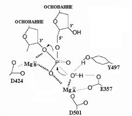 Рис. 1.2. Переходное состояние в (3’®5’)-экзонуклеазной реакции, катализируемой ДНК-полимеразой I E. coli. Главными лигандами двух катионов Mg2+ являются остатки D424 и D501. Роль карбоксильной группы Е357 как лиганда катиона металла является менее существенной, но этот остаток необходим для экзонуклеазной активности. Расположенный рядом с активным центром остаток Y497 может участвовать в установлении правильного положения субстрата