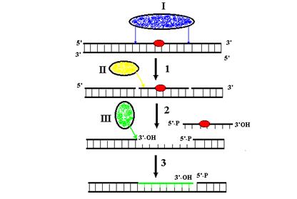 Рис. 1.4. Репаративный синтез ДНК в процессе нуклеотидной эксцизионной репарации. 1 – инцизия поврежденного участка нити ДНК эксцизионными эндонуклеазами, 2 – расплетание сегмента нити ДНК между ОР ДНК-лигазой и освобождение этого сегмента из дуплекса, 3 – репаративный ресинтез однонитевой бреши ДНК. I – эксцизионная эндонуклеаза, II – ДНК-геликаза, III – ДНК-полимераза