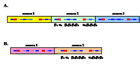 Рис. 1.15. Доменная организация скользящих зажимов ДНК-полимераз. А – белок DnaN E. coli, В – эукариотический белок PCNA - ядерный антиген пролиферирующих клеток. В домене 2 указано взаимное расположение a-спиралей и b-нитей в первичных последовательностях этих белков, которое сохраняется и в доменах 1 и 2