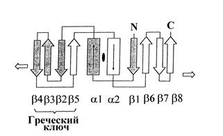 Рис. 1.16. Схема укладки a-спиралей и b-нитей в каждом домене скользящих зажимов ДНК-полимераз. Стрелки указывают на переход в соседние домены с такой же организацией укладки