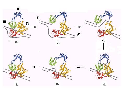 Рис. 2.28. Последовательныке стадии релаксации одного витка негативно суперспирализованной ДНК ДНК-топозомеразой I E. coli. I, II, III и IV – домены топоизомеразы I, указанные на рис. 2.27. Отмечено положение 3’- и 5’-концов разрезаемой нити ДНК