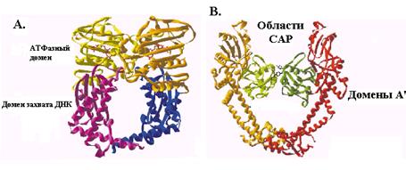 Рис. 2.30. Трехмерная структура субъединиц ДНК-гиразы E. coli. А – димер N-концевой половины (остатки 1-392) субъединицы GyrB, В – димер фрагмента остатков 30-522 субъединицы GyrA
