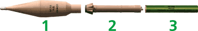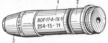 | | 1 - головная часть со взрывателем, 2 - реактивный двигатель, 3 - стартовый пороховой заряд со стабилизатором.