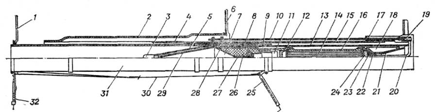 12 – переходное дно; 13 –внутренняя труба; 14 – пороховой заряд реактивного двигателя; 15 –направляющая линейка; 16 – камера; 17 –корпус ударного механизма; 18 –перо стабилизатора; 19 –запал; 20 –трубка (газоотвод); 21 –сопло; 22 –пробка; 23 –диск; 24 –воспламенитель; 25 –задняя крышка; 26 –разрывной заряд; 27 –проводник; 28 –воронка;