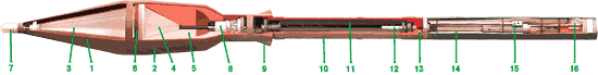 | | 1- обтекатель, 2 - корпус, 3 - токопроводящий конус, 4 -воронка с проводником, 5 - кумулятивный заряд, 6 - изоляционное кольцо, 7 - головная часть, 8 - донная часть, 9 - сопловый блок, 10 - труба, 11 - пороховой заряд, 12 - пирозамедлитель-воспламенитель, 13 - капсюль-воспламенитель, 14 - крестовина, 15 - перья, 16 - турбинка с трассером.