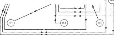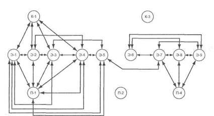 Рис. 2. Участие в спорах по поводу окон 228 Рис.2 показывает работников, которые участвовали в этих спорах, и их взаимодействие. Эта диаграмма должна интерпретироваться таким же образом, как и диаграмма игр. В качестве участника споров рассматривался каждый, кто принял в них участие даже вербально. Главный смысл этой диаграммы заключается в том, что большинство споров по поводу окон происходило в группе В (Э-6, Э-7, Э-8, Э-9 и П-4). 90% всех споров приходилось на ссоры среди членов этой группы и между этой группой и другими работниками в комнате наблюдения. В ссорах с работниками, не являвшимися членами этой группы, участвовали П-1, Э-4 и Э-5. Споры по поводу окон среди членов группы А были редки и происходили между Э-4 и Э-5 и между П-1 и Э-5. Подмена на рабочем месте (job trading) Подмена на рабочем месте уже упоминалась в связи с отношениями между электромонтерами и паяльщиками. Подробные записи этих подмен велись на протяжении всего исследования и графически отображены на рис.33. Контролеры не включены в эту диаграмму, поскольку они не участвовали в подменах. Стрелки направлены от того, от кого исходила просьба о подмене, к тому, кто согласился выполнить эту просьбу. Цифры около стрелок показывают, сколько раз обозначенные люди участвовали в подмене.