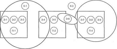 На основе материала, который только что был рассмотрен, можно сделать некоторые выводы относительно неформальной организации данной группы работников. Во-первых, совершенно ясно, что на вопрос, поставленный в начале предыдущего раздела, нужно дать отрицательный ответ: эти работники не объединялись на основе рода занятий, они не образовывали профессиональных клик. Во-вторых, столь же очевидно, что в данной группе существовала определенная структура отношений. Лишь за одним исключением каждая изученная запись говорила нечто об этой структуре. Рассматривали ли исследователи игры, принудительные замены, ссоры по поводу окон, отношения дружбы или вражды — всегда вырисовывались две группы. Одна из этих групп располагалась в передней части комнаты, вторая — в задней. «Группа впереди» и «группа сзади» — этими названиями пользовались сами работники. Первая из этих групп будет обозначаться как клика А, вторая — группа в задней части комнаты — как клика В. Чем определялось членство в этих двух кликах? На этот вопрос можно ответить лишь приблизительно. Клика А включала в себя Э-1, Э-3, Э-4, П-1 и К-1. Клика В включала в себя Э-7, Э-8, Э-9 и П-4. Э-5, П-2 и К-3 не входили ни в одну из клик. Ситуация с Э-2 и Э-6, однако, не была столь ясной. Э-2 принимал участие в играх клики А, но на этом сходство его поведения с поведением клики кончалось. Он мало участвовал в беседах, которые вели члены клики, и был склонен к самоизоляции от них. Многое в его поведении говорило за то, что он не ощущал свое положение в группе как прочное. Он был единственным электромонтером в рабочей группе А, который менялся работой с П-4 — паяльщиком из клики В, а со своим паяльщиком он менялся больше, чем кто-либо другой в группе. Поскольку социальной функцией подмены было отделение электромонтеров от паяльщиков, данное обстоятельство можно интерпретировать следующим образом: Э-2 ощущал острую необходимость укрепить свое положение путем подчеркивания своего вышестоящего статуса по отношению к паяльщикам. Принимая во внимание все данные, можно заключить, что Э-2 не был полноценным членом клики А. Э-6 тянулся к клике В. Он постоянно крутился вокруг электромонтеров селекторов и практически не имел дела с членами клики А. О том, что он не был полностью принят в клику В, свидетельствуют многие обстоятельства, главным из которых является то, как клика В совместными усилиями противодей- ствовала его попыткам доминировать над кем-либо из группы. Тем не менее он принимал значительно большее участие в жизни клики В, чем Э-2 в жизни клики А. Можно заключить, что хотя Э-6 стремился присоединиться к клике В, он все же во многих отношениях оставался чужаком. На рис.7 отражены результаты этого исследования. На нем в виде диаграммы представлена внутренняя организация обследуемой группы. Рабочие группы, на которые разделены члены обследуемой группы, обозначены тремя прямоугольниками. Два больших круга разделяют две клики — А и В. Выделяются три индивида — К-3, Э-5, и П-2, которые определенно не входили ни в одну из клик5. Линия вокруг Э-6, накладывающаяся на клику В, указывает, что он принимал частичное участие в ее деятельности. Нестабильность положения Э-2 отражается пунктирной линией вокруг его номера.