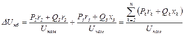 где Pk, Qk – мощность нагрузки k-го узла; rk, xk – сопротивление от узла 1 до узла k; n – количество узлов.