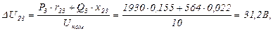 По первому закону Кирхгофа найдём активные мощности, передаваемые по линиям: P12=P2+P3=1880+1930=3810 кВт; P23=P3=1930 кВт. По активным мощностям и коэффициенту мощности находим реактивные мощности в линиях: Q12 = P12 tg φ = 3810× 0, 292 = 1113 кВАр; Q23 = P23 tg φ = 1930× 0, 292 = 564 кВАр. Потери напряжения в линиях 23 и 12