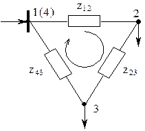 Характерным частным видом простой замкнутой сети является кольцевая сеть (рис. 4.2, а), она содержит один замкнутый контур. В качестве источников питания могут служить или электростанции или шины подстанций, в свою очередь связанные сетью с электростанциями системы. Кольцевая сеть на рис. 4.2, а может быть представлена в виде линии с двусторонним питанием (рис. 4.2, б). Действительно, если источник питания в узле 1 мысленно разделить на два и представить в виде узлов 1 и 4, то из кольцевой сети на рис. 4.2, а получим линию с двусторонним питанием на рис. 4.2, б.