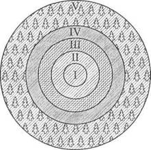 Если прежде всего обратиться к национально-немецко-аграрному строю, как он является перед нами в XVII столетии, чтобы затем проследить его назад в глубь прошлого до древнейших времен, от которых остаются лишь скудные и плохо освещенные источники, мы вынуждены ограничиться территорией, первоначально заселенной германцами. * Цит. по: Вебер М. История хозяйства. Город. / Пер. с нем. под ред. И. Гревса. М., 2001. С. 25 — 32. Цитируемый текст иллюстрирует содержание главы 8 базового пособия учебного комплекса по общей социологии. Если представить схему территории древней германской деревни в виде концентрических кругов, то первое, самое внутреннее кольцо включит совершенно неправильно разбросанные дворовые усадьбы; между ними ветвятся соединительные дороги.