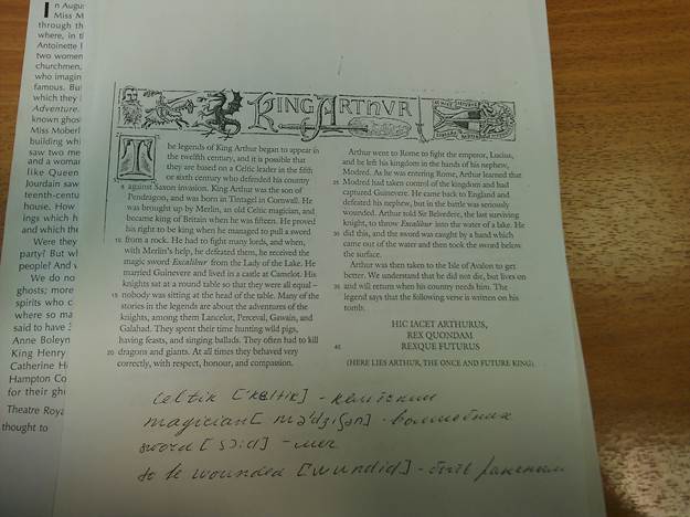 Легенда о Короле Артуре появилась в 12 в. и это есть возможность, что они основаны на Кельтских деятелей в 5 или 6 в., которые защитили свою страну против Саксонского нашествия. Король Артур был сыном Пентдрагона, был рожден в Тинтагеле в Корнволле. Он был воспитан Мерлином и старым кельтским магом и стал королем Британии, когда ему было 14. Он доказал свою правоту быть королем когда он организовал вытащить меч из скалы. Он имел схватку со многими лордами и когда, с помощью Мерлина, он разгромил их, он получил за это волшебный меч Эксалибур из озера Лэди. Он женился на Гуневере и жил в замке Камелота. Его рыцари сидели за круглым столом, так что они были все равны – никто не сидел во главе стола. Много истории в легендах есть о приключениях рыцарей, одни из них Ланкелот, Перцевал, Гавайн и Галахад. Они тратили свое время на охоту диких свиней, пиры, пение баллад. Они часто убивали драконов и гигантов. Все это время они вели себя корректно, с уважением, честью, состраданием. Артур пришел в Рим побороться с императором, Люциус, который оставил свой королевский дом в руках его племянника, Модреда. Так он входил в Рим, Артур узнал, что Модред осуществляет контроль над королевским домом и отбил Гуневеру. Он вернулся назад в Англию и разгромил своего племянника, но в сражении был серьезно ранен. Артур сказал Сэру Иельведоре, что последний выживший рыцарь, выкинул волшебный меч в воды озера. Он сделал это, и меч достали рукой, которого принесла по течению вода и затем взяли меч внизу поверхности. Артур затем переехал на остров Авалон где ему было лучше. Мы понимали, что он не умрет, но живет и будет продолжать жить когда его страна нуждается в нем. Легенда говорит о том что написано нижне на его гробнице: здесь лежит Артур, однократный и будущий король.