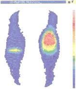 Рис.3. Сиамские близнецы: внешний вид, рентгенограмма, МРТ|. 4. Ультразвуковое исследование (УЗИ), то есть сонографию| опорно-двигательного аппарата используют для изучения состояния|стана| мягких тканей. Его целесообразно применять для обследования детей. Применение этого метода не имеет противопоказаний. Сонографию чаще всего используют для оценки нестабильности тазобедренного| сустава в случае его дисплазии, для выявления|обнаружения| выпота|потоотделения| или гематомы в полости больших|великих| суставов, повреждений суставных хрящей, сухожилий и связок, а также инородных тел, особенно|в особенности| нерентгенконтрастных. Под УЗ-контролем выполняют|исполняют| иголочную аспирацию или биопсию. 1 Рис.4. УЗИ: 1 – нормальный тазобедренный| сустав; 2 - выпот|потоотделение| в суставе. 5. Радионуклидные методики исследования скелета. Радиометрия – метод определения радиоактивности симметричных участков скелета с помощью клинических радиометров (ГАММА) после введения в организм РФП (99mTc–пирофосфат, 32Р и др.). Чаще применяют остеосцинтиграфию с 99mTc–пирофосфатом, который вводят внутривенно, активностью 350-500 МБк. Исследование начинают через 3 часа. В норме 99mTc–пирофосфат хорошо фиксируется в костях черепа, позвоночника, таза, ребрах и крупных суставах. Первичные опухоли костей накапливают РФП в значительном количестве – на 400-600% больше, чем симметричные участки здоровой костной ткани (рис. 5.1, 5.2). Метастазы фиксируют РФП на 100-300% больше здоровых участков (рис. 5.3). В сравнении с рентгенологическими методами остеосцинтиграфия позволяет диагностировать метастазы раньше на 6-8 месяцев. Для получения послойного изображения зоны интереса применяют ОФЭКТ с 99mTc-пертехнетатом.