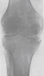 Рис..17. Абсцесс Броди. РЕВМАТОИДНЫЙ АРТРИТ преимущественно поражает мелкие суставы кистей и стоп. Рентгенологически: остеопороз, утолщение отдельных трабекул|, утолщение суставной сумки, сужения суставных щелей. На боковых краях костных поверхностей -| краевые разрастания. В эпифизарных| концах костей -| кистовидные| просветления|. На краях эпифизов| костные разрастания в виде заостренных краев. Иногда блюдцеобразные| вдавления в центре суставной впадины|, в которую|какую| входит суставная головка.