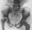 Рис.14. Туберкулезный коксит. Spina ventosa tuberculosa - туберкулез диафизов| трубчатых костей. Рентгенологические признаки: деформация (утолщение), деструкция, секвестр в виде “кусочка тающего сахара”, периоститы|. Завершение: исчезновение деструкции и периостита. ОСТЕОМИЕЛИТ| - гнойное заболевание костей, обычно стафилококковой этиологии. Различают острый гематогенный|, огнестрельный, первично-хронический и вторично-хронический остеомиелит|. Частота поражения: бедренная кость - 46%, большеберцовая| кость - 42%, плечевая кость - 10%, другие кости - 3%. Обычная форма остеомиелита| протекает в 4 фазы: І - фаза острого воспаления|зажигания| костного мозга - флегмона, II - прорыв процесса под надкостницу и образование поднадкостничного| абсцесса; Ш – некроз кости; ІV - фаза секвестрации и репарации. Рентгеновские признаки определяются|проявляются| на 12-16 день заболевания: очаг деструкции в метадиафизе, | окруженный остеосклерозом, в центре секвестр (кортикальный|, центральный, проникающий, тотальный), вдоль длинника| кости линейный, бахромчатый| периостит. Огнестрельный остеомиелит| является следствием развития гнойной инфекции при огнестрельных переломах. 1 Рис..15. 1 – виды секвестров; 2 – острый остеомиелит|; 3 – хронический остеомиелит|; 4 – огнестрельный остеомиелит|. Вторично-хронический остеомиелит| - следствие острого гематогенного| остеомиелита|, характеризуется выраженным костеобразованием в виде обширных участков остеосклероза, окруженных участками разреженной или нормальной костной ткани, секвестрами, расположенными в полостях со склерозированными| контурами, периоститами| (кружевной|, гребневидный|, полосатый). АТИПИЧНЫЕ ФОРМЫ. Эпифизарный остеомиелит| встречается в 72% случаев в возрасте до 2 лет и вызывается стрепто-|, стафило| - и пневмококками. Процесс чаще локализуется в эпифизе| бедра, протекает остро. Эпифиз полностью разрушается, возникает нагноение сустава, прорыв гнойника с образованием свища|. На рентгенограмме бедренная кость деформирована, отсутствуют эпифиз| и часть метафиза|; вертлужная| впадина сглажена, бедренная кость в состоянии вывиха кверху и сочленяется с подвздошной костью. Вертлужная впадина в процесс не втягивается. ХРОНИЧЕСКИЙ ПЕРВИЧНО-СКЛЕРОЗИРУЮЩИЙ| ОСТЕОМИЕЛИТ| ГАРРЕ|: начало первично-хроническое, появляется отек в мягких тканях (инфильтрация мышц), ограничение подвижности в соседних суставах. Рентгенологически: остеосклероз, эбурнеация| (деструктивных очагов, полостей, секвестров нет) и гиперостоз|.
