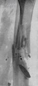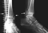Рис..19. Сифилитический остеохондрит|. 2. Периоститы: периостальные изменения|смены| (наслоения) располагаются неравномерно относительно|в отношении, касательно| сторон кости: на вогнутых сторонах наблюдаются более мощные тени наслоений. Оссифицирующие периоститы| (множественные, симметрично расположенные, часто системные являются типичным|типовым| проявлением раннего врожденного сифилиса). 3. Гумозные поражения могут быть врожденные и приобретенные. Рентгенологически выявляются|проявляются| в периосте| или эндосте| деструктивные изменения|смены| в виде овальных или округлых очагов просветления.