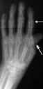 Рис..18. Ревматоидный артрит. СИФИЛИТИЧЕСКИЕ ЗАБОЛЕВАНИЯ КОСТЕЙ. При раннем врожденном сифилисе встречаются| его следующие формы: 1. Остеохондрит - это системное сифилитическое поражение скелета в зонах энхондрального| окостенения. Рентгенологически различают 3 стадии изменений|смен|: І стадия - расширение зоны предыдущего|предварительного| обызвествления|; II - светлая полоса между линией зоны обызвествления| и костью (развитие грануляционной ткани); ІІІ - выраженные деструктивные изменения|смены|, край кости зубчатый, рваный, возможны патологические переломы.