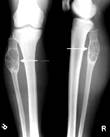 Рис..26. Остеолитическая саркома, рентгенограмма и МРТ|. При остеобластическом| типе наблюдается бластоматозный| рост в виде пятнистых|пятнистых| теней разной|различной| формы и величины, расположенных в зоне опухоли, в участке поражения развивается игольчатый периостит.