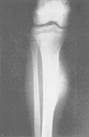 Рис..27. Остеобластическая саркома. При смешанном типе остеогенной| саркомы имеет место разнообразная|разнообразная| комбинация деструкции и патологического (злокачественного) костеобразования. На месте опухоли кость веретенообразно утолщена, корковый слой разрушен, часто наблюдается игольчатый или козырьковый| периостит.