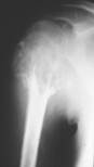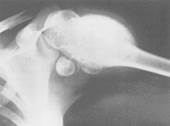 Рис..22. Хондрома плечевой кости. ГЕМАНГИОМА. Чаще локализируется в позвоночнике|хребте|, существуют кавернозная и капиллярная формы. При кавернозной гемангиоме структура изменена за счет наличия вертикально направленных грубых и толстых трабекул|, которые напоминают колонны. Капиллярные гемангиомы образуют мелкоячеистый| рисунок. Межпозвонковые диски не изменены, возможны патологические переломы.