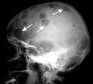 Рис..30. Саркома Юинга. МИЕЛОМНАЯ БОЛЕЗНЬ - злокачественная опухоль костного мозга. Различают следующие разновидности: 1) множественно-очаговая; 2) диффузно-поротическая|; 3) остеосклеротическая|; 4) изолированная (солитарная|). Миелома разрушает костную ткань. Рентгенологически: выявляются|проявляются| множественные округлые дефекты, диаметром от нескольких миллиметров до нескольких сантиметров с резкой контурированностью| каждого отдельного дефекта (пробойниковые дефекты). Реактивных изменений|смен| со стороны соседних тканей не бывает.