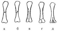 Рис..37 Направление линий перелома: а – поперечный, б|б| – косой, в - продольный, г – Т- образный, д – У- образный