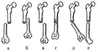 Рис..39. Виды смещения отломков: а – боковое, б|б| – продольное с захождением|захождением|, в – продольное с расхождением, г – продольное с вклиниванием, д – под углом, е – по периферии. 1. Боковое (по ширине) смещение может быть полным и неполным. При неполном смещении определяют, на какую часть диаметра кости сместились отломки (на 1/2, на 1/3 и т.д.). 2. Продольное смещение - с расхождением или с захождением|захождением| отломков. 3. Смещение под углом. Величина угла смещения определяется в точке пересечения продольных осей| отломков. 4. Смещение по периферии - вокруг длинной оси вращается|оборачивается, обертывается, обращается, поворачивается, вращающийся| дистальный отломок.