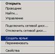 Чтобы переименовать файл или папку, щелкните на имени, чтобы подсветить его, подождите секунду и щелкните на нем еще раз. Прежнее имя файла сначала подсвечивается, а затем исчезает, как только вы начинаете вводить в рамочке новое имя файла (папки). Набрав новое имя, нажмите Enter или щелкните на рабочем столе. Не всегда получается переименовать файл щелчком на его имени. В этом случае щелкните на имени файла или папки правой кнопкой мыши и выберите из появившегося меню Переименовать. Внимание! Ярлык может быть создан для любого объекта – диска, папки, программы, документа, устройства (например, сетевого сервера, другого компьютера или принтера). Следует отметить, что ярлыки можно располагать как на Рабочем столе, так и в любом окне, папке или документе. В значке ярлыка обязательно присутствует стрелка, что и отличает ярлык от «настоящих» файлов, папок и дисков. На самом деле ярлык – это файл особого вида Не имея ярлык программу или документ открыть можно, но на это затратится гораздо больше усилий. При удалении ярлыка программа остается на диске. Создавать ярлыки можно различными способами. I способ. Чтобы создать ярлык необходимо выполнить следующие действия: 1) Найдите объект, для которого следует создать ярлык, в папке Мой компьютер или с помощью Проводника Windows. 2) Нажмите правую кнопку мыши по нужному объекту. Выберите команду Создать ярлык.
