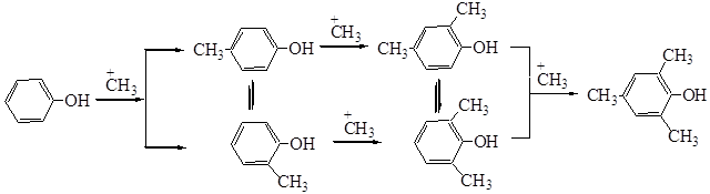 Алкилирование протекает последовательно с образованием моно-, ди- и триалкилфенолов. Одновременно происходит кислотно-катализируемая перегруппировка с миграцией алкильных групп: