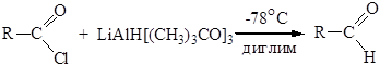 Активность катализатора снижается добавкой контактных ядов, например тетраметилтиомочевины (ТМТМ). Одним из лучших методов восстановления хлорангидридов кислот является восстановление три- трет -бутоксиалюмогидридом лития при -78°С. Специфический восстановитель и низкая температура исключают дальнейшее восстановление альдегида до спирта.