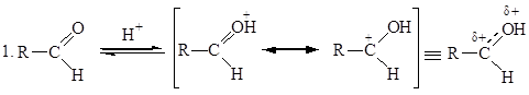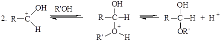 На первой стадии происходит протонирование атома кислорода карбонильной группы, на второй стадии образовавшийся карбокатион присоединяет молекулу спирта, реакция завершается депротонированием аддукта. Активация карбонильной группы в реакциях присоединения воды и спиртов может происходить двумя способами: